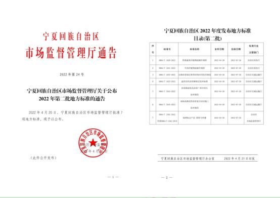 近日,宁夏回族自治区市场监督管理厅印发《关于公布2022年第二批地方标准的通告》,由公司起草编制的《沥青路面乳化沥青厂拌冷再生技术规范》(DB64/T 1824-2022)正式发布,将于2022年7月20日起实施。