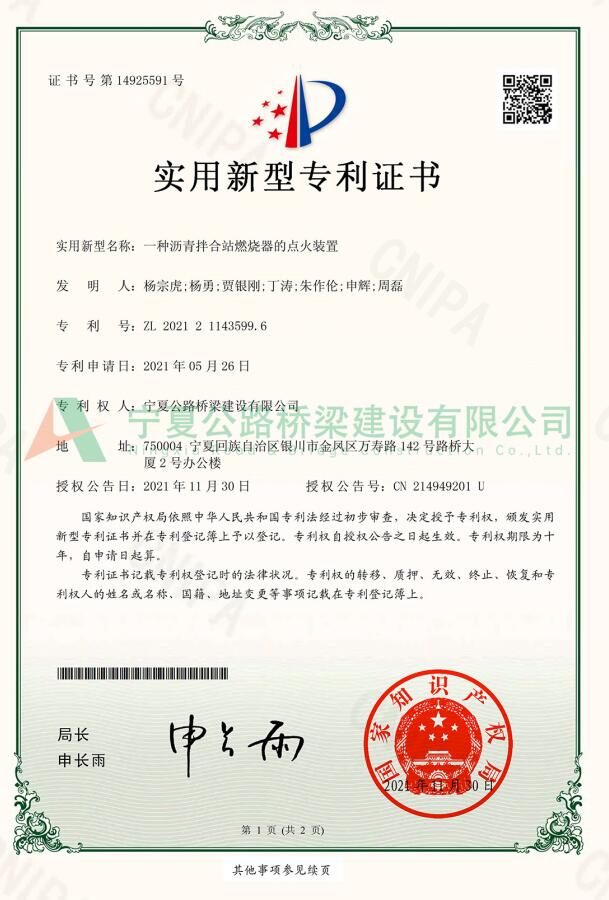 实用新型专利:一种沥青拌合站燃烧器的点火装置