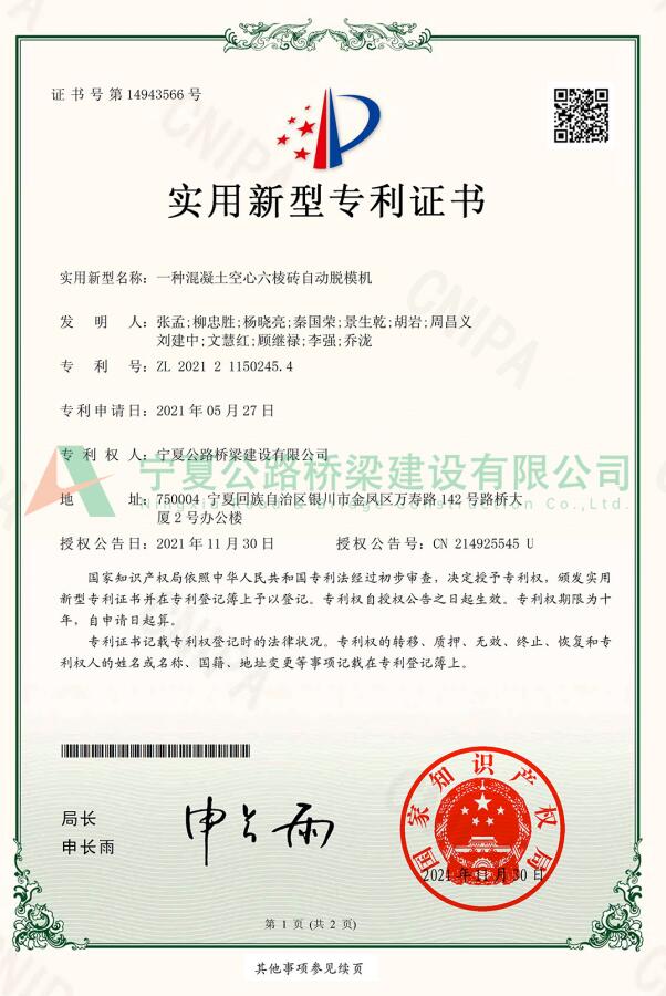 实用新型专利:一种混凝土空心六棱砖自动脱模机