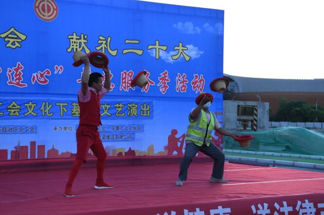 19时整,文艺演出准时开始,一曲《奋进新时代》歌舞表演拉开了演出的序幕,演出有搞笑、科普的相声演出《你好宁夏》,有民间艺术川剧表演《变脸》,还有精彩的男女生独唱。互动杂技表演《滑稽手技》将晚会推向了高潮,表演嘉宾在完成高难度杂技表演后,邀请在场工人现场教授表演特技,学习过程紧张而精彩,台下观众掌声不断。