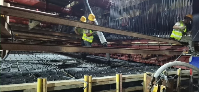 此次浇筑的首件底板厚1.2米,宽28.1米,长19米,浇筑方量690方,总浇筑面积534平方米。