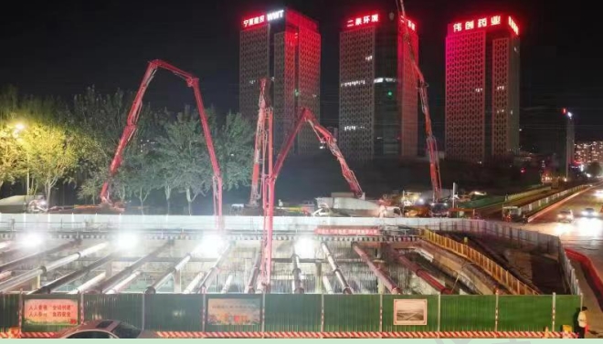 7月20日凌晨5时,银川市贺兰山路与民族街快速化改造AYX爱体育暗埋段4#块段底板浇筑顺利完成,标志着隧道暗埋段关键节点施工取得了阶段性突破,吹响了主体结构全面施工的攻坚号角。