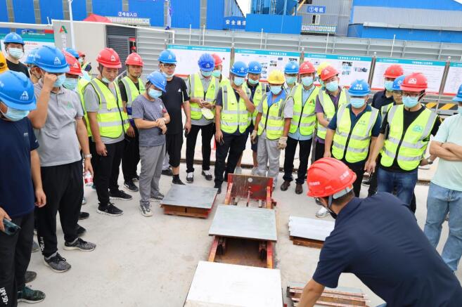 交流团队在实体T梁现场,项目总工又结合样板展示牌和实体T梁,将楔形块的调整、封锚端的密闭、梁体的防漏浆、钢绞线的工作长度控制等施工细节做了详细的分享。